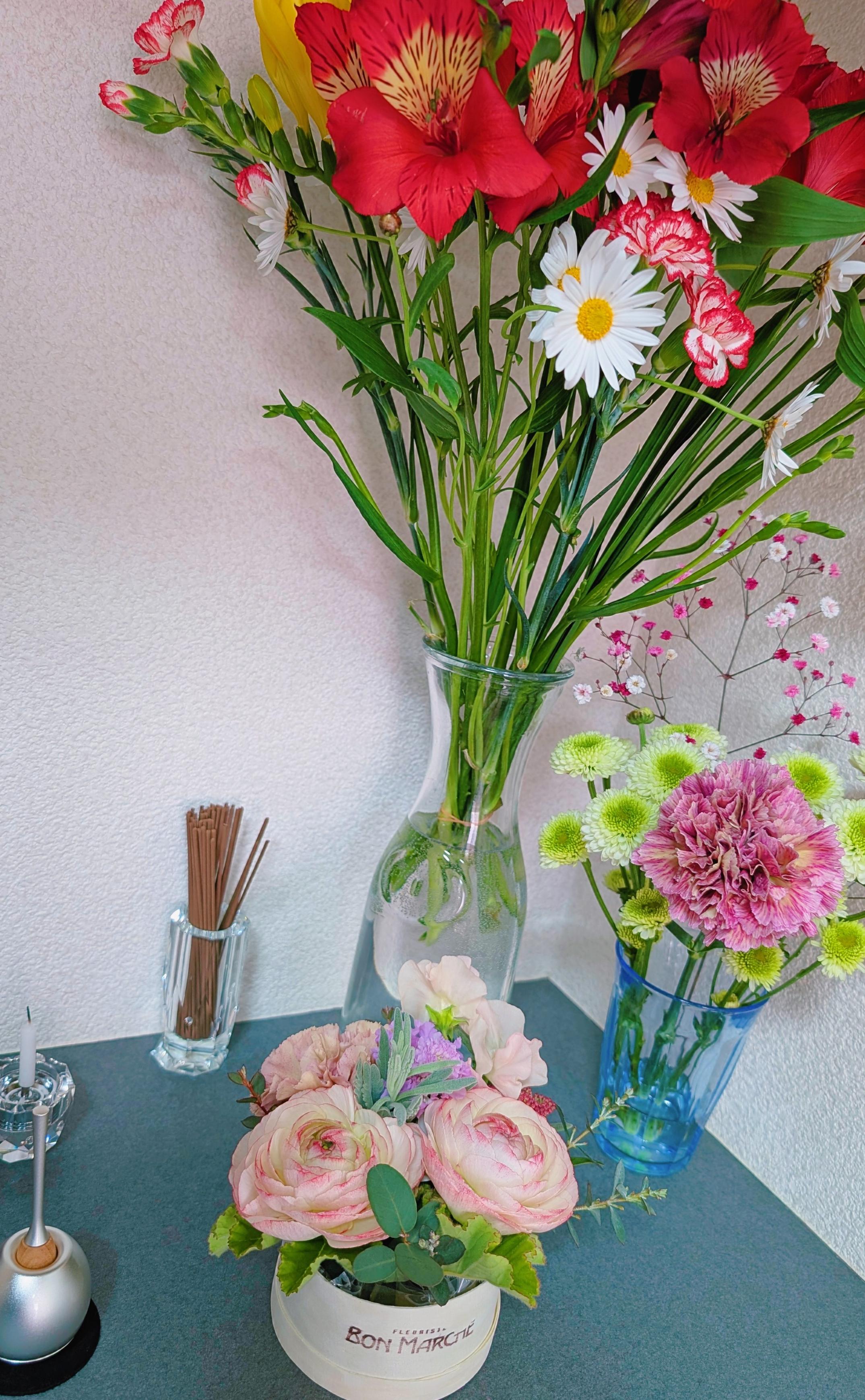 桜の開花宣言を聞き、お花見はいつにしましょう、とカレンダーと天気予報を眺めています。 先日、カメラが趣味の生徒さんが、稽古風景を良いカメラで撮ってくれました。 稽古風景を撮る機会は滅多にないので、とても良い記念になりました。 ![]() ![]() ![]() ![]() 別の稽古日…… 新年会で私が提供したビンゴの景品。 名古屋帯が当たった生徒さんが、早速稽古日に締めて来てくれました。 帯締め帯揚げと、帯の刺繍の色を合わせられたのですね。 お洒落でとても良くお似合い♪ 早速活用してくれて嬉しいです。 ![]() ![]() 愛兎が12歳(人間で95歳位)で旅立ちました。 日頃からペットの話を私としてくれていた生徒さん達が、お供えのお花と手作りのリースを贈ってくれました。 優しい色のアレンジメント、たくさんのごちそうのついたリース、虹の橋のたもとで、とても喜んでいると思います。 温かな御心に、私もなぐさめられました。 ありがとうございました。 ![]() ・ ![]() |